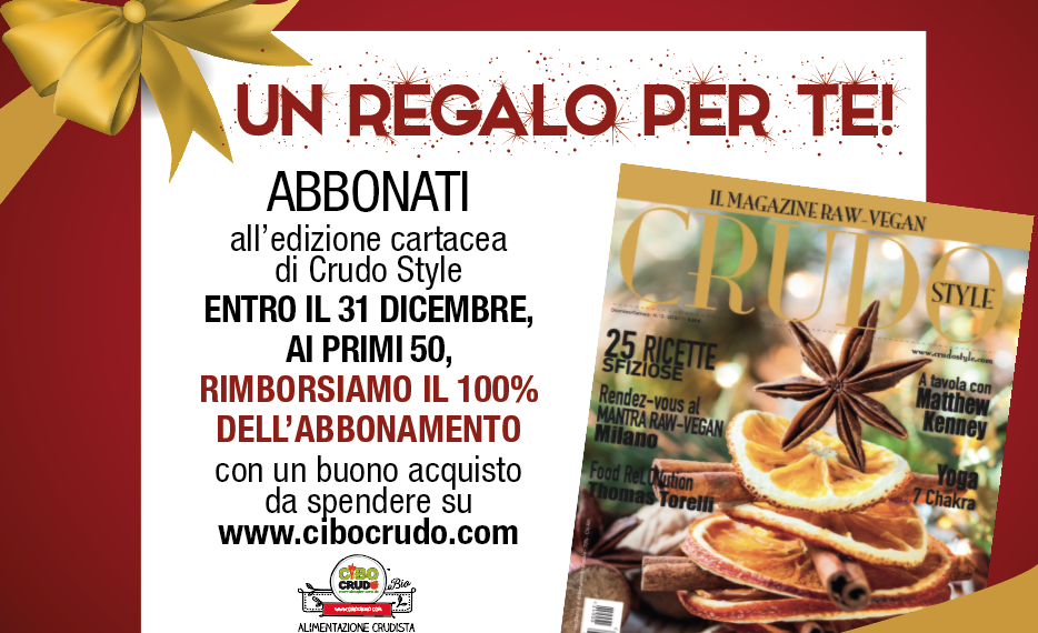 *La promozione riguarda un abbonamento di 6 numeri cartacei dal valore di 21,60 € ed è valida solo per i primi 50 nominativi che sottoscriveranno suddetto l’abbonamento entro il 31/12/2016. Il coupon avrà un codice sconto dello stesso importo di 21,60 € (utilizzabile su www.cibocrudo.com entro il 28/02/2017) e vi verrà inoltrato per mail non appena ricevuto il pagamento l’avvenuto acquisto sino ad esaurimento dei 50 coupon disponibili.